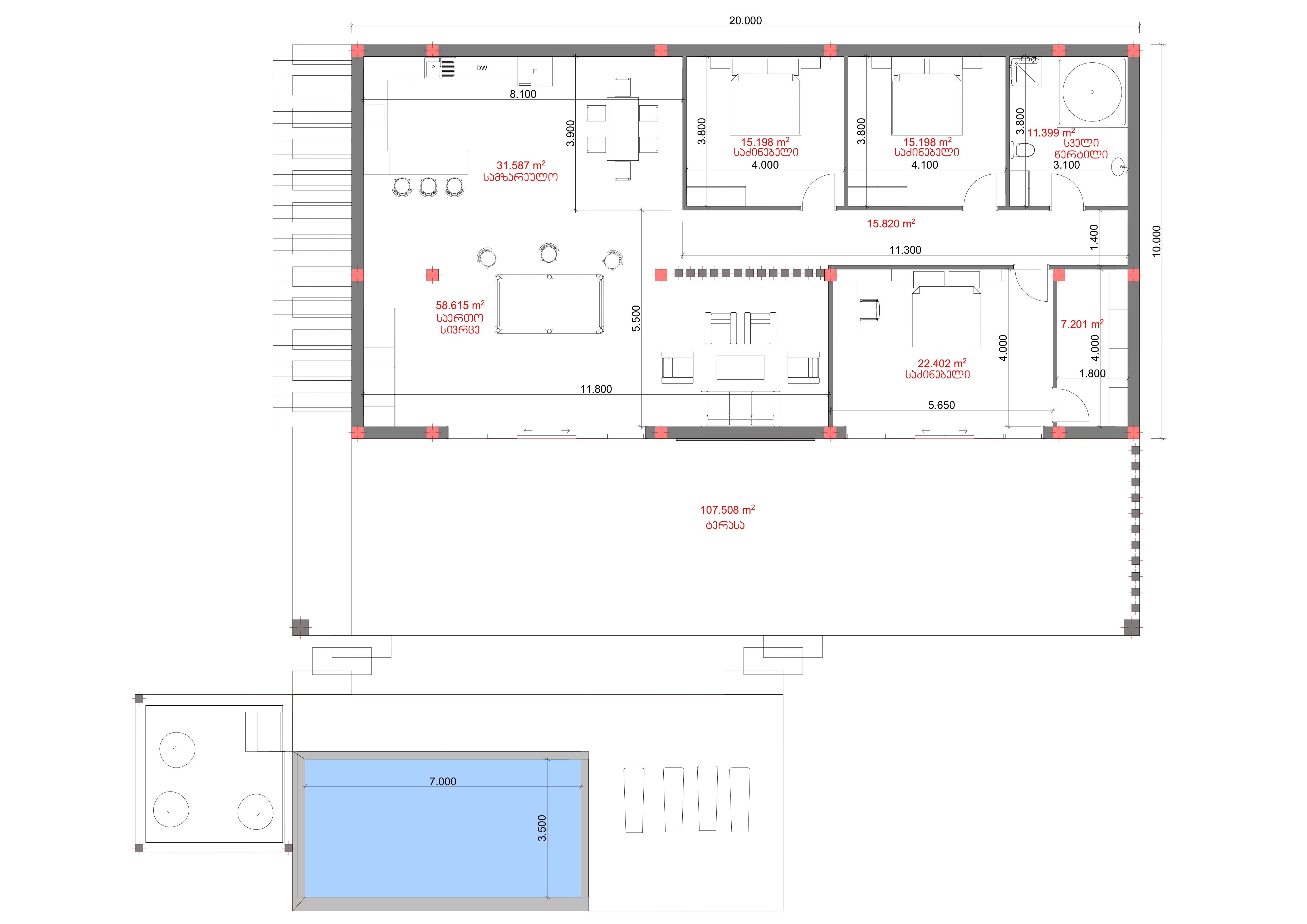 თანამედროვე ერთსართულიანი საცხოვრებელი/სააგარაკე ტიპის ინდივიდუალური სახლი, მოცემული პროექტი მოიცავს, ტოპოგრაფიას, გეოლოგიას,აზომვით ნახაზებს, მშენებლობის ნებართვის აღებას, პროექტის მომზადება-შეთანხმებას, კონსტრუქციულ ნახაზებს, ენერგო და წყალგაყვანილობის გეგმებს, შესაბამის მუნიციპალურ სამსახურებში თქვენს წარმომადგენლობას.